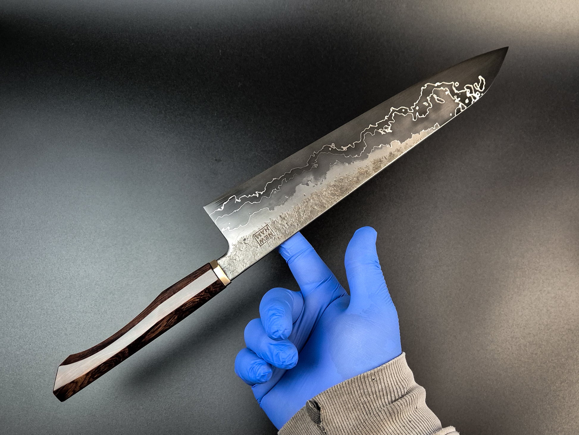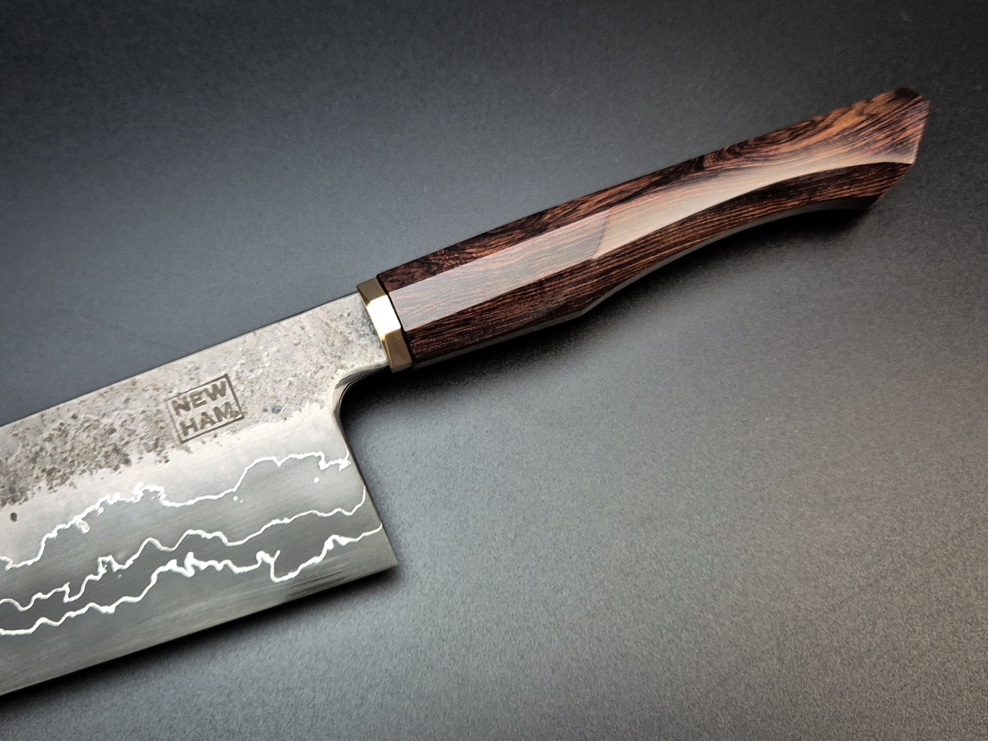 265x59mm gyuto in 52100 core with nickel and vintage iron multilayer cladding