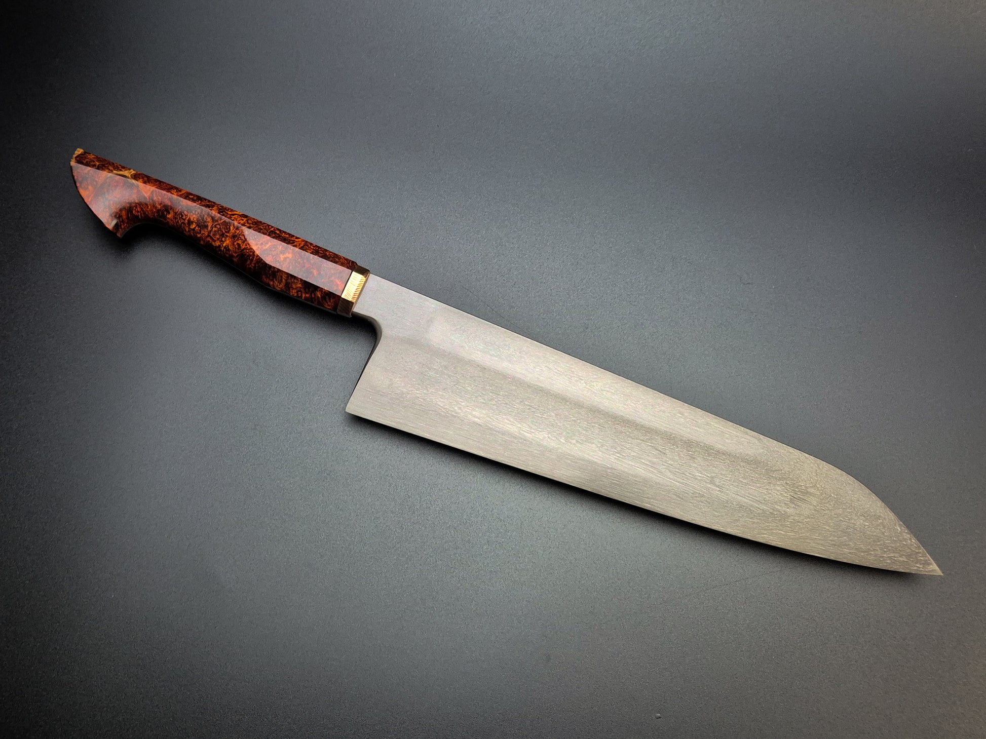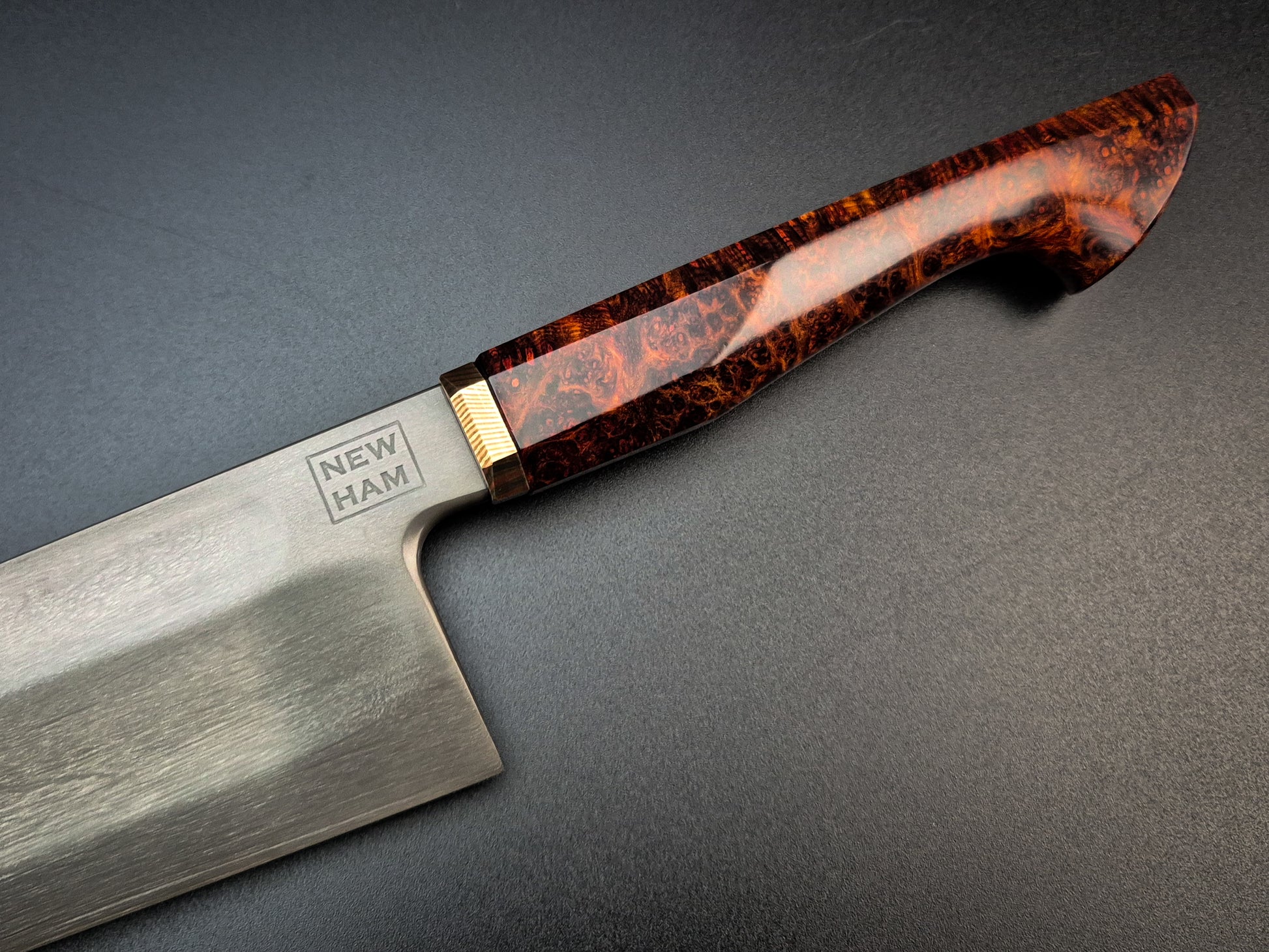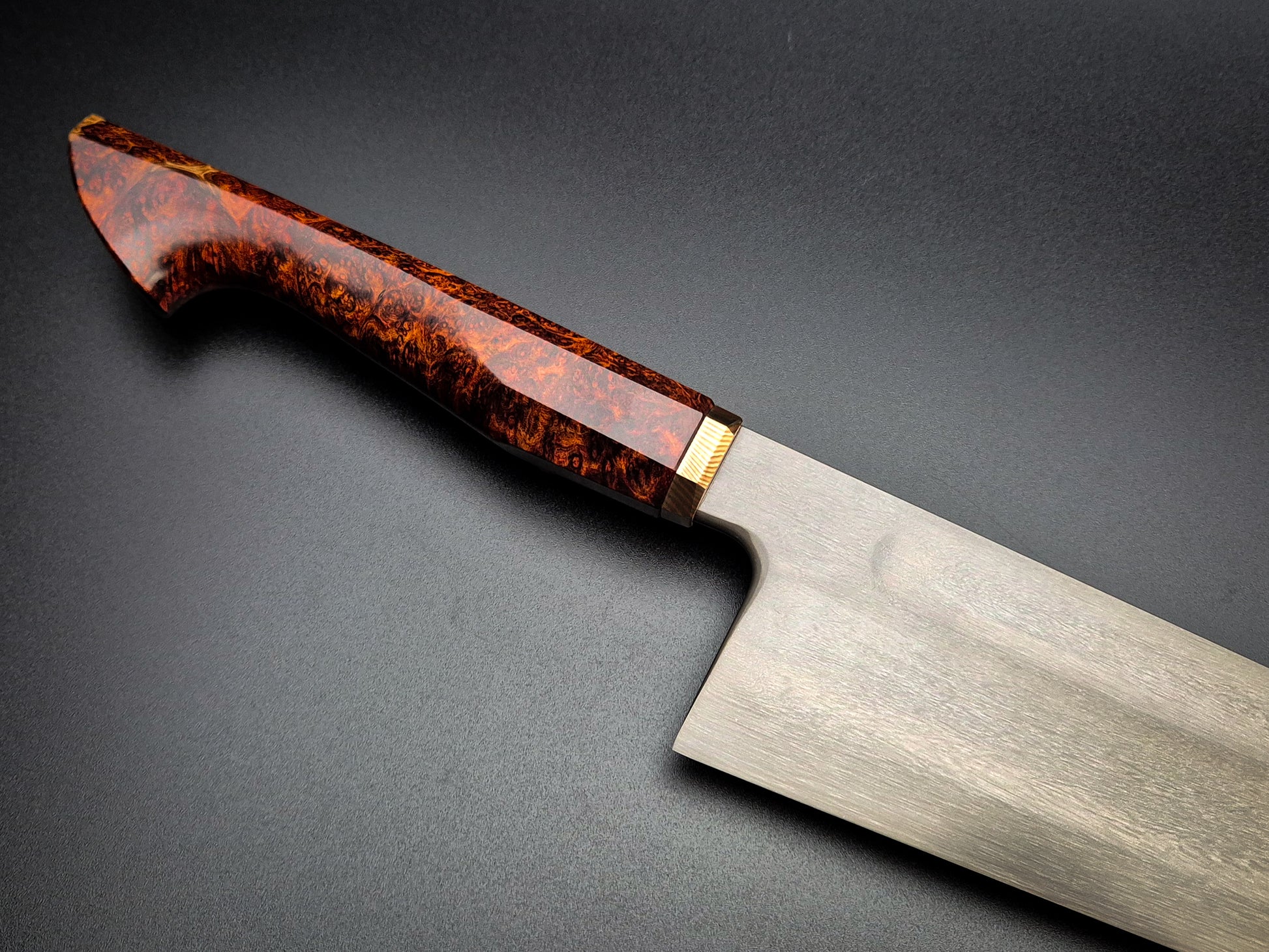 The handle is Red Amboyna with lightly etched heirloom fit Mokume bolster.