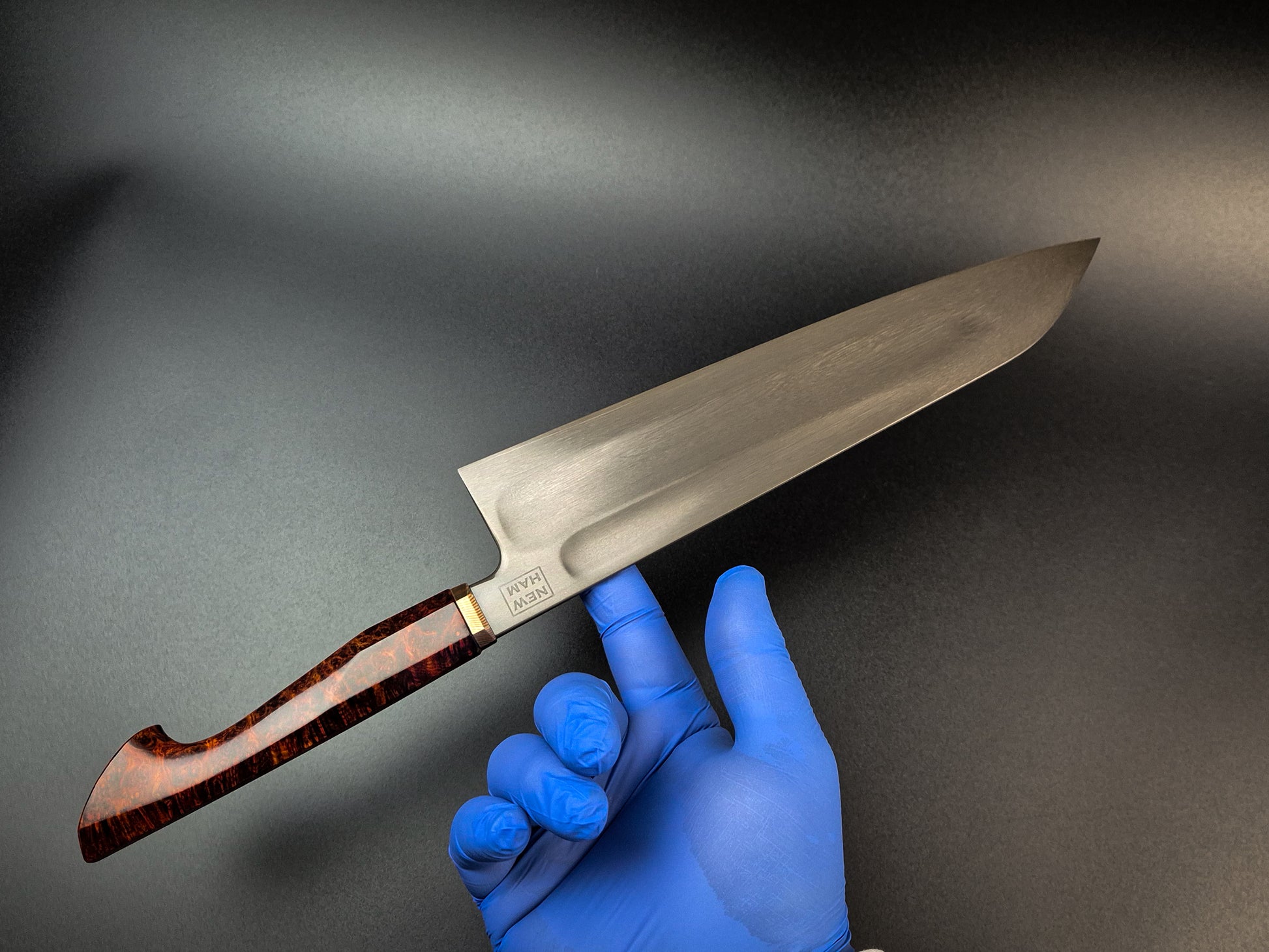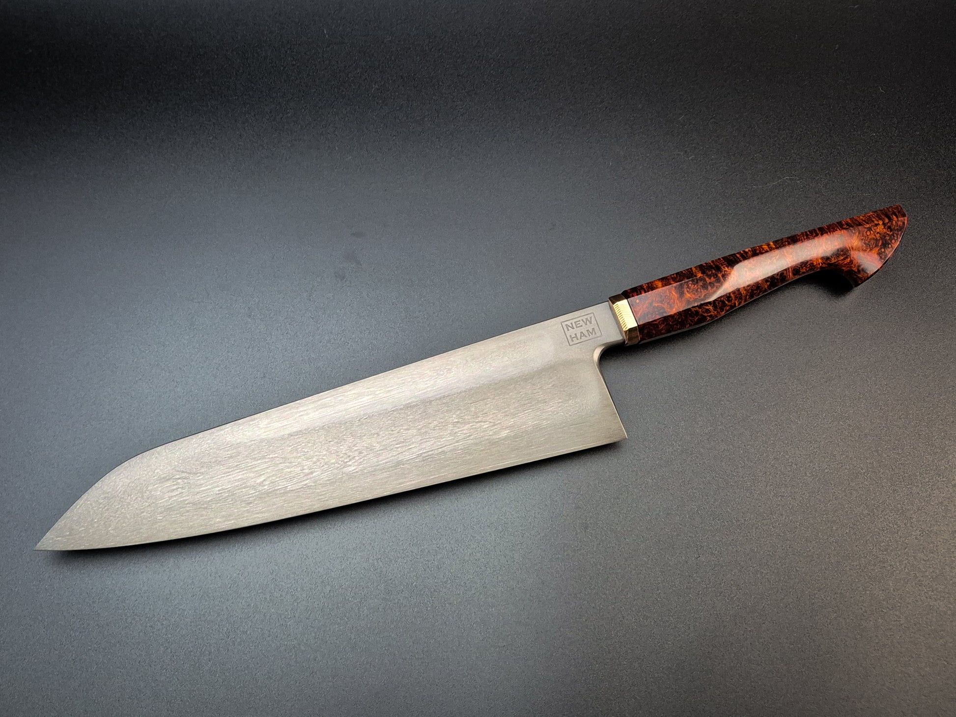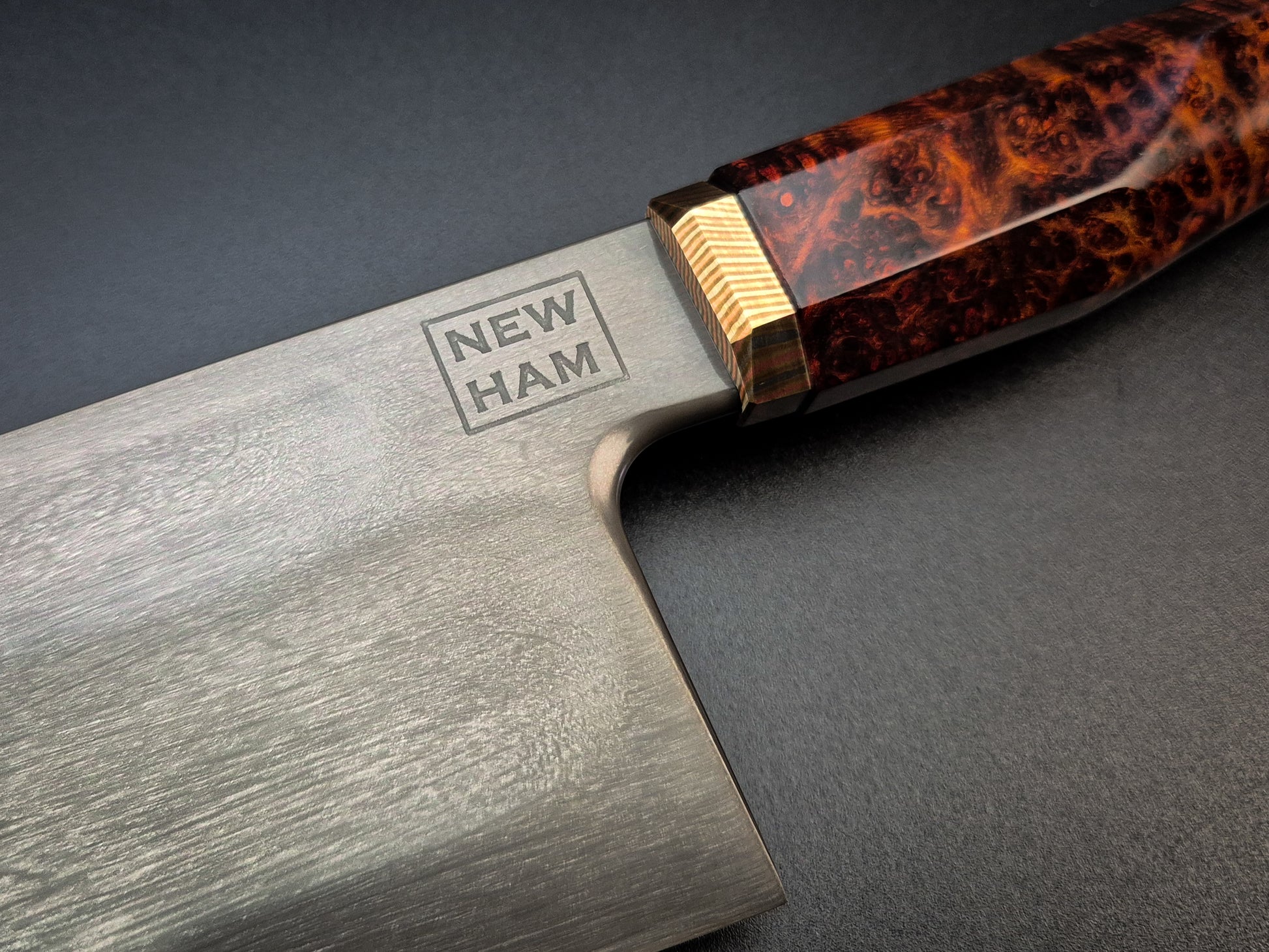 The handle is Red Amboyna with lightly etched heirloom fit Mokume bolster.