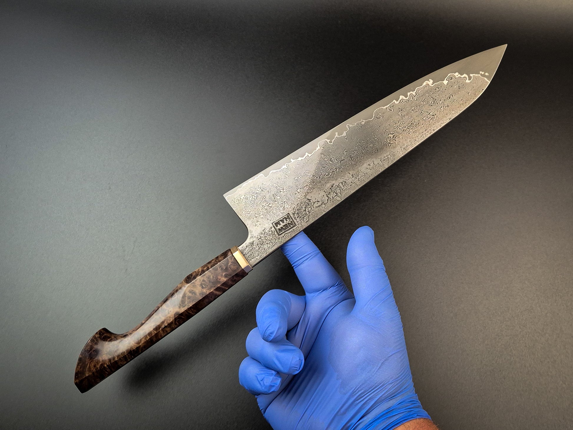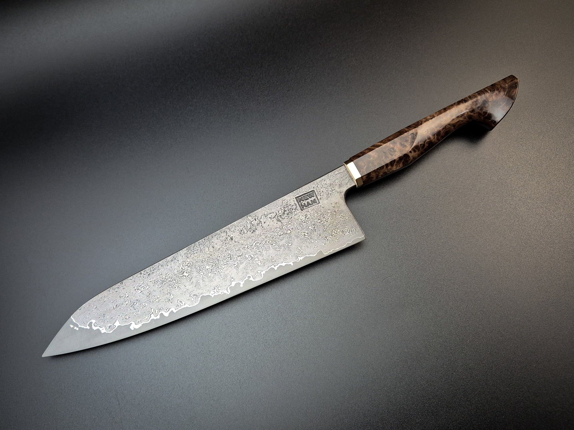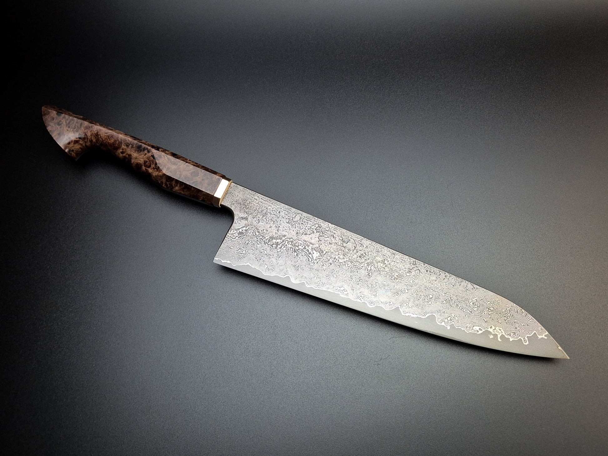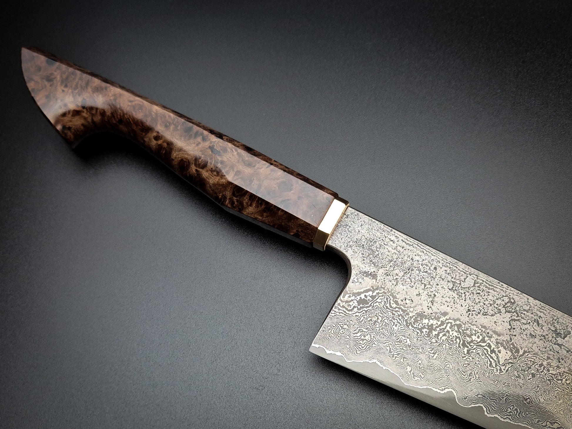 The handle is stabilised Ebony burl with heirloom fit brass bolster.