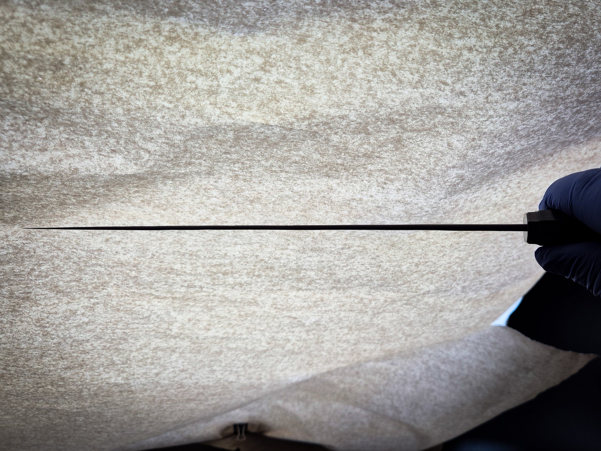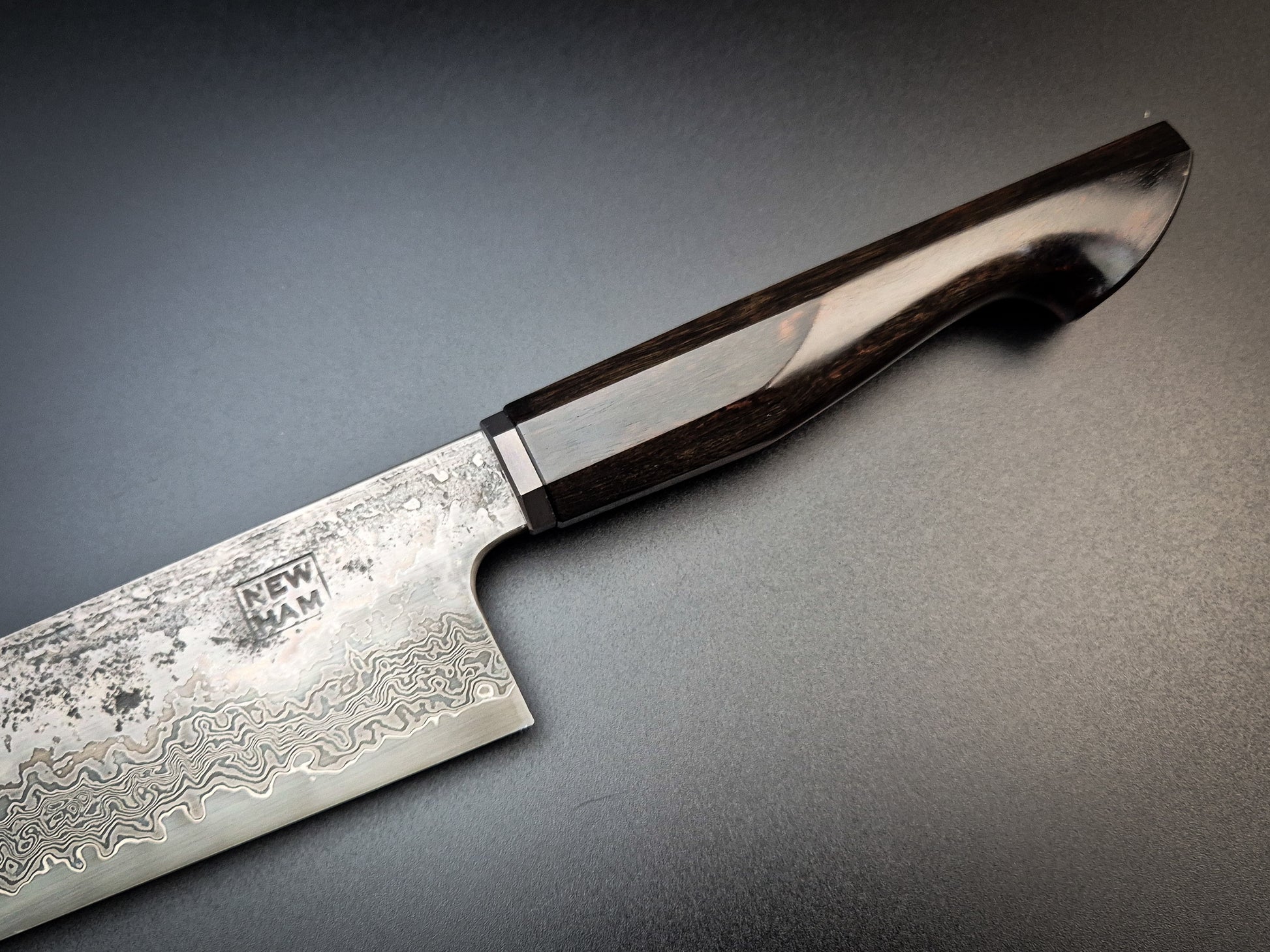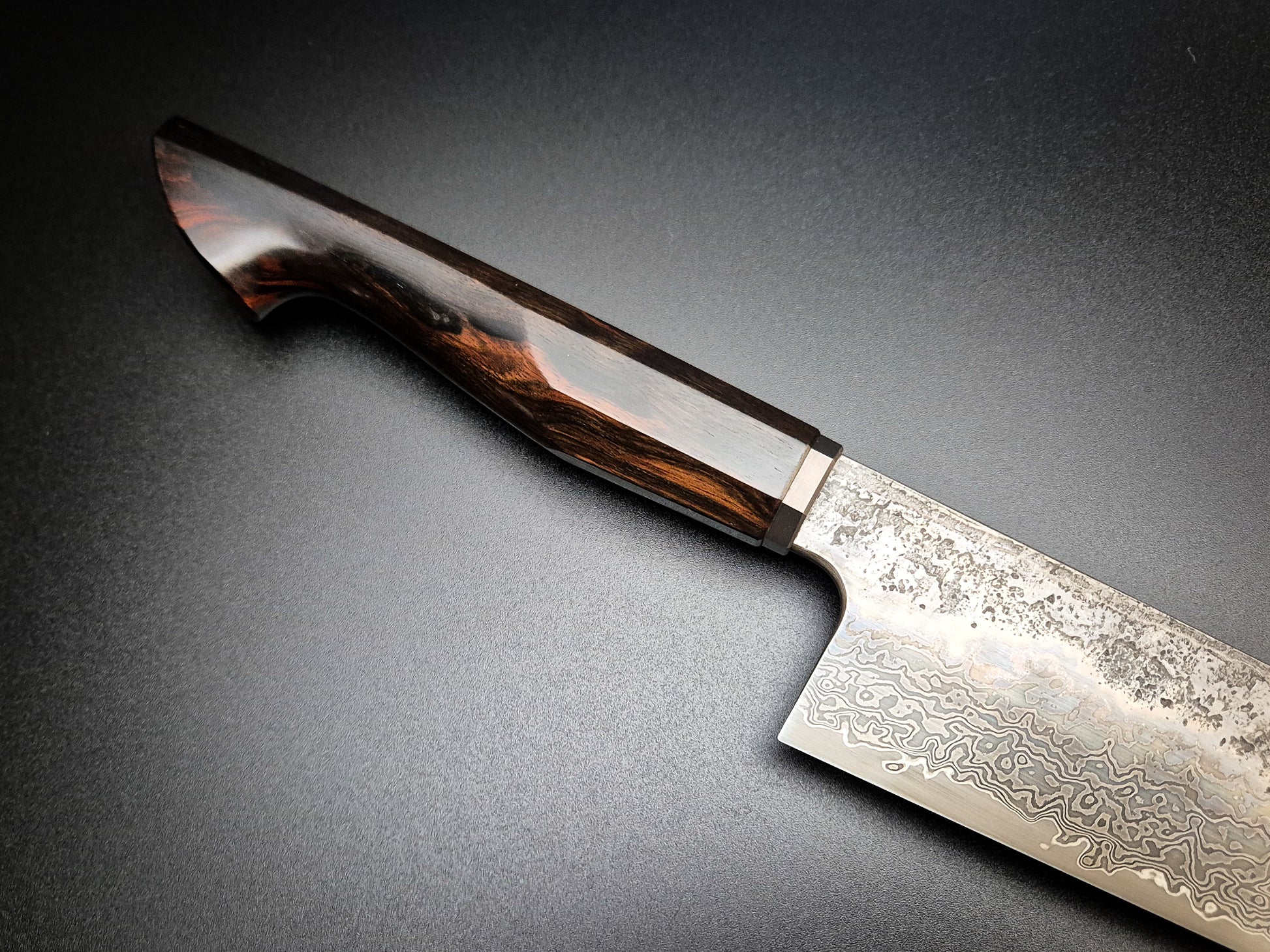 Convex grind with thin edge and sharp distal taper for ultimate performance. Polished spine and choil with satin, hand polished bevels with some forge finish and etched to highlight the steel pattern.