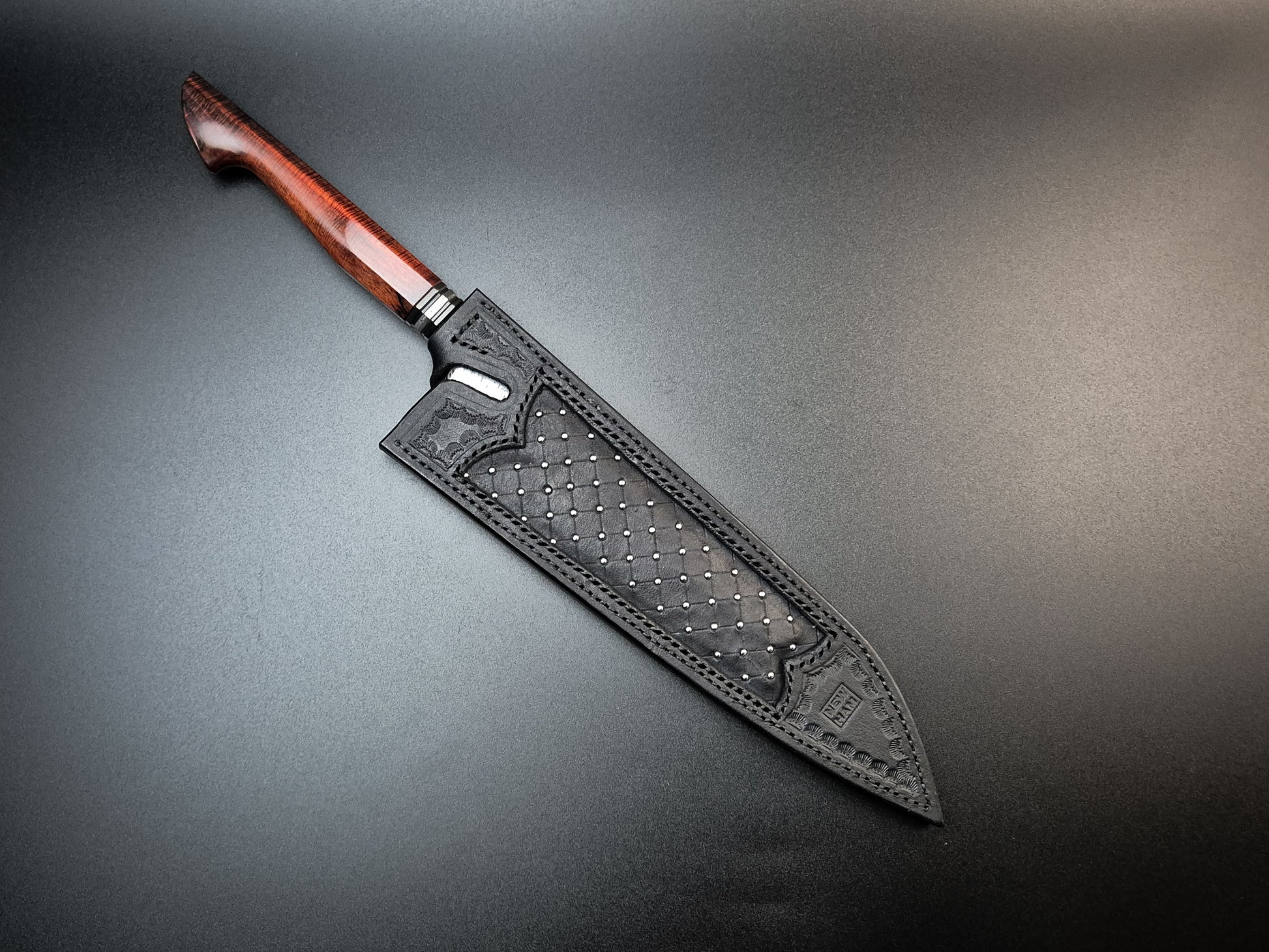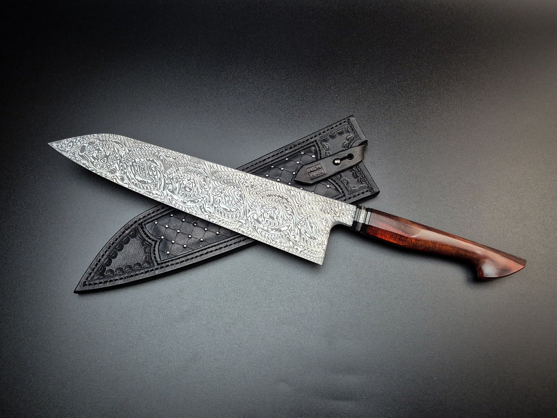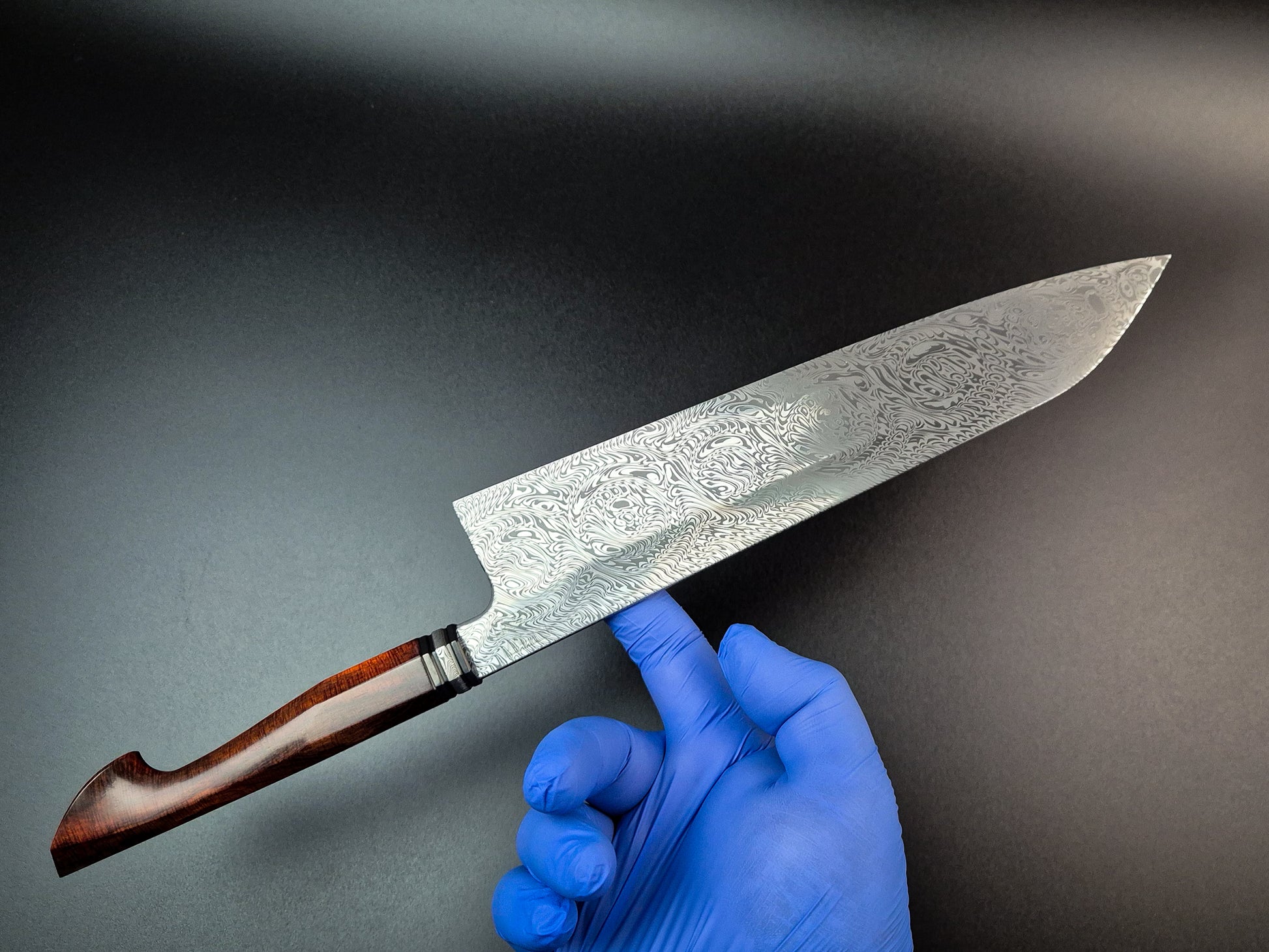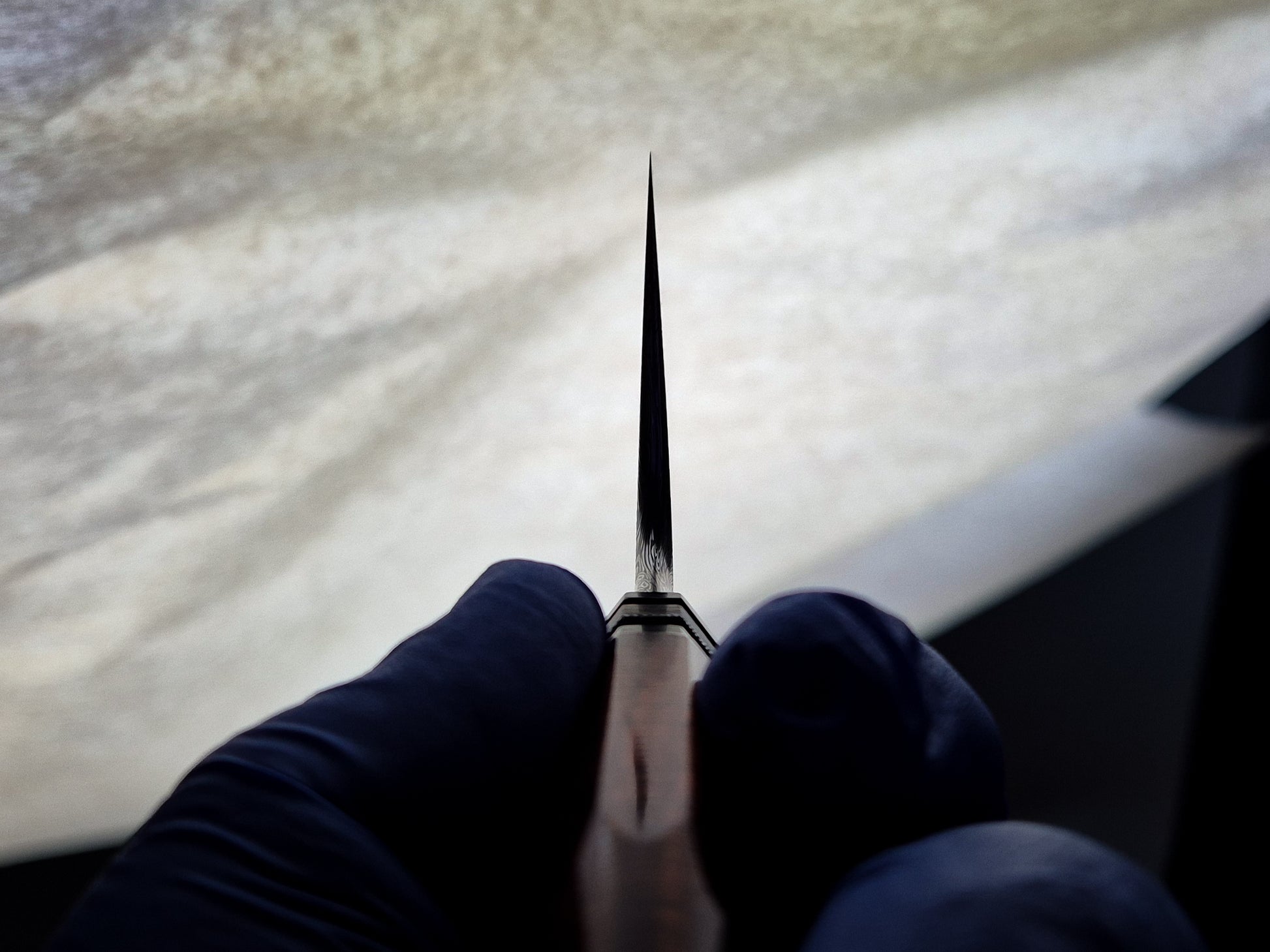 Ground with thin edge and sharp distal taper for ultimate performance. Polished spine and choil with satin, hand polished bevels. Etched and polished to highlight the steel pattern.