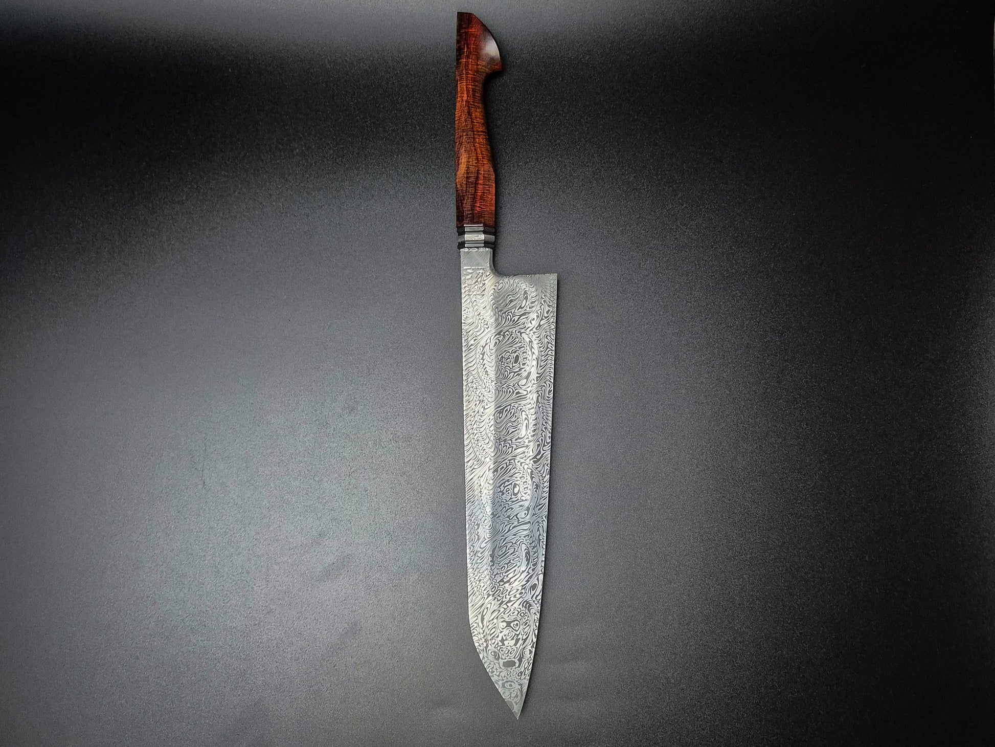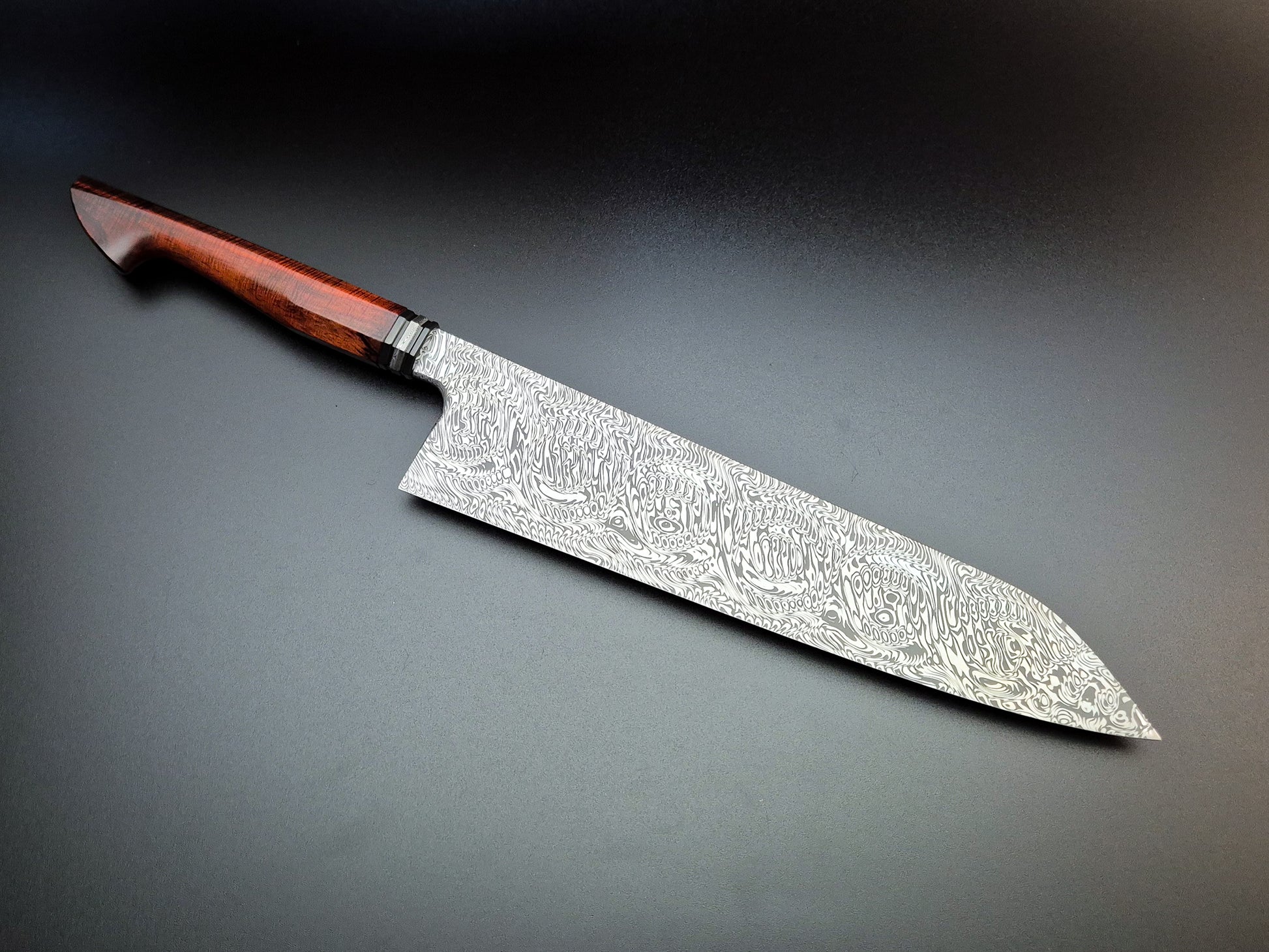 240x54mm double fuller gyuto in Damasteel stainless damascus 'Grabak' pattern.