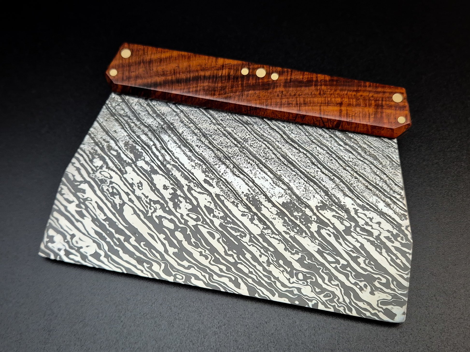 The blade has been forged with a ground and polished edge and etched to highlight the steel pattern