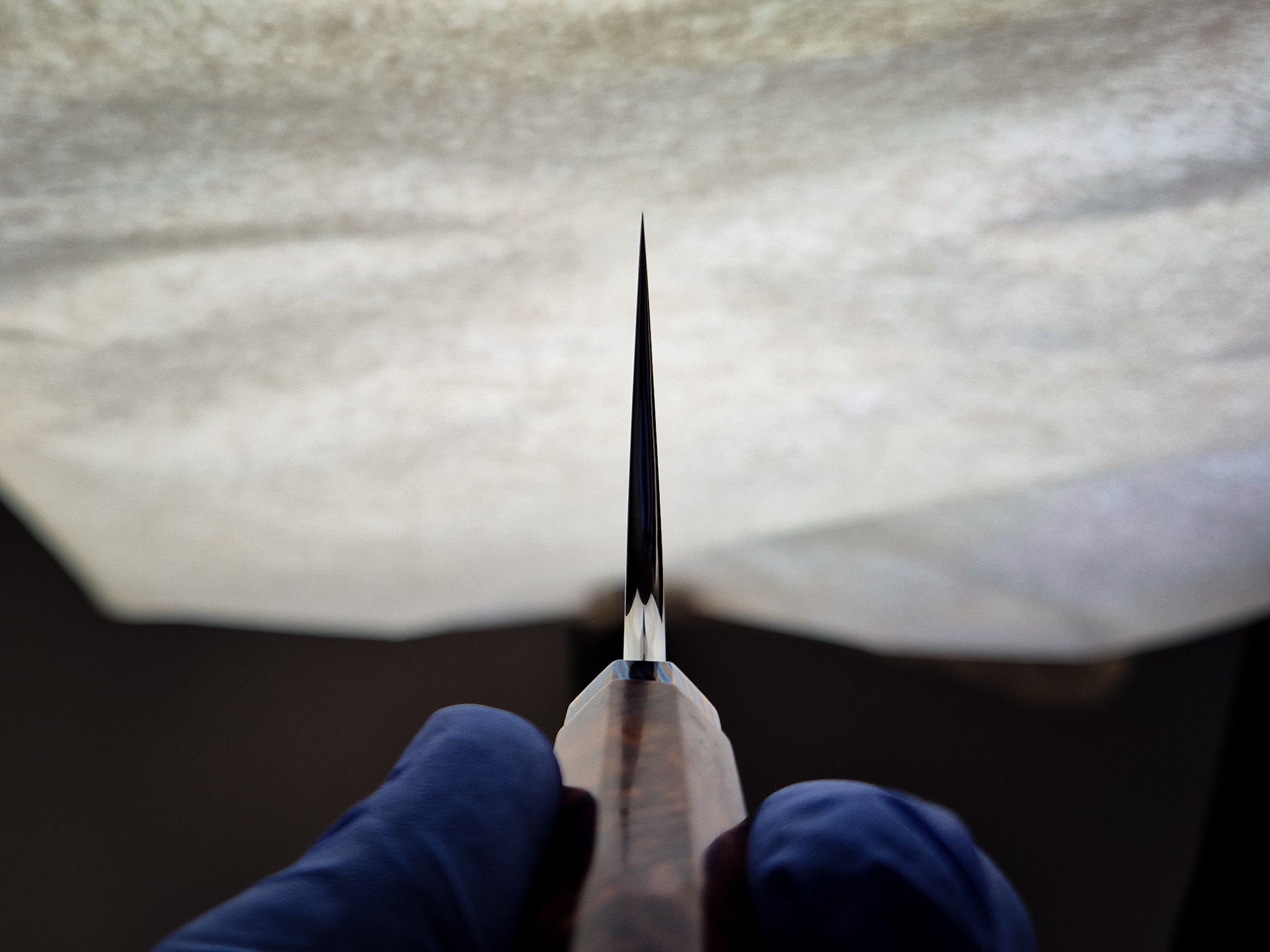 Ground with thin edge and sharp distal taper for ultimate performance. Polished spine and choil with satin, hand polished bevels.