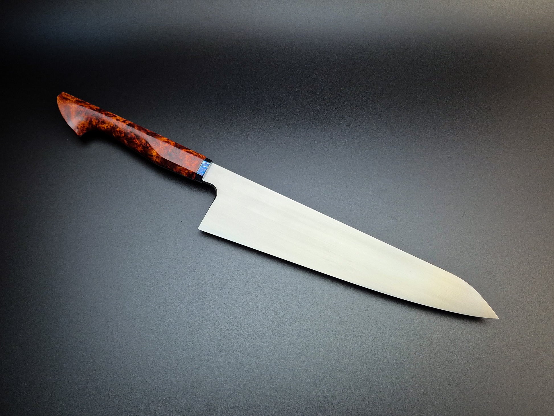 The handle is Amboyna Burl with heirloom fit Timascus bolster.