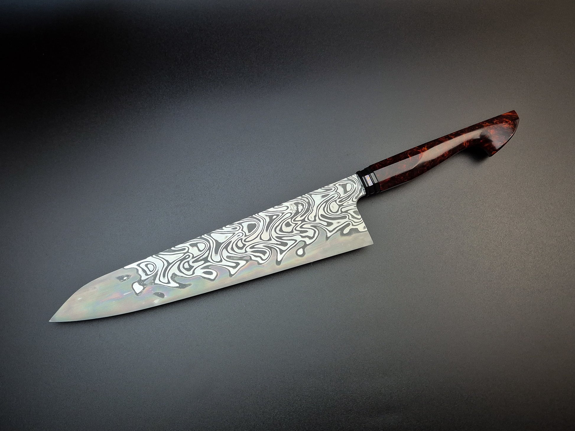 244x55mm gyuto in Damasteel Damacore N11X Thor pattern with Vanax core.