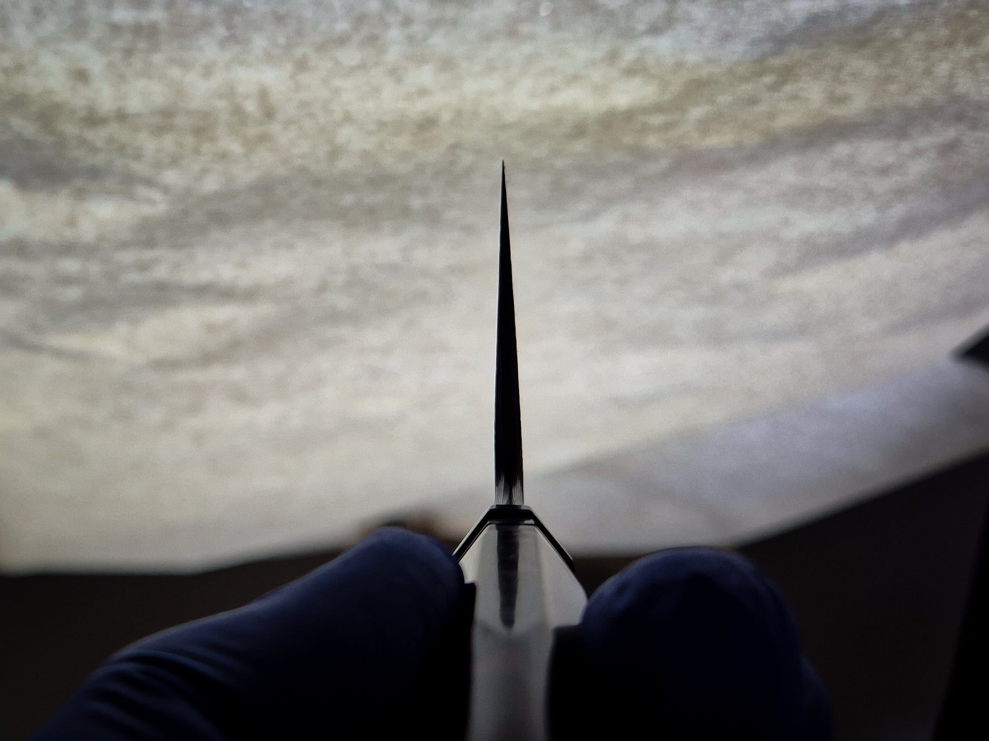 Please note this is a high hardness, keen edged high performance knife and as such care must be taken to protect the edge (i.e. please do not cut frozen foods).