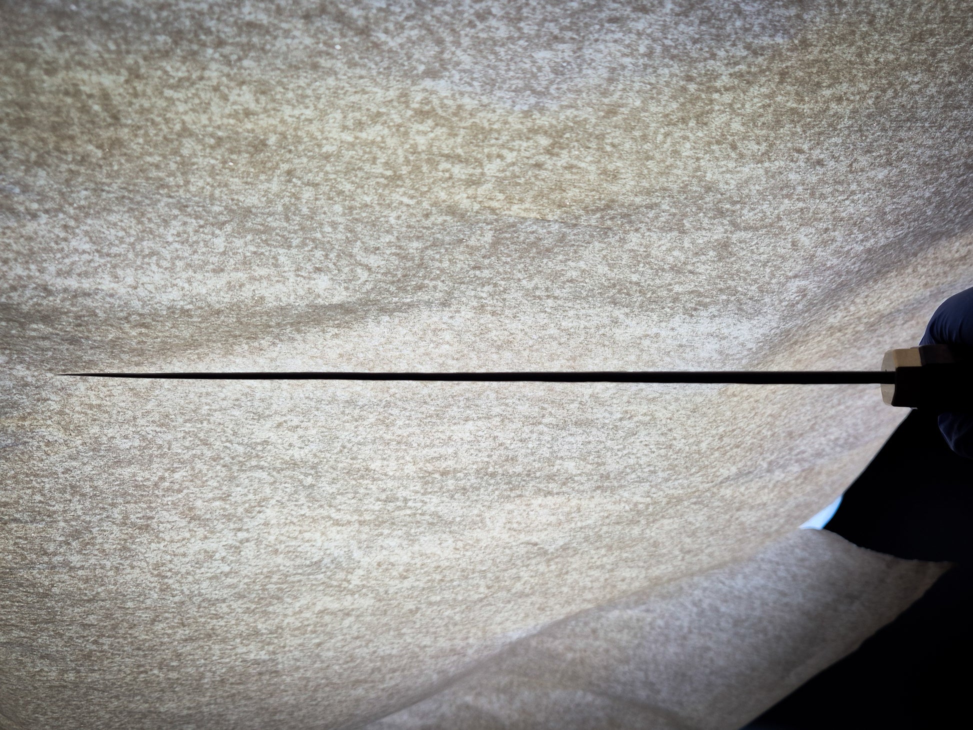 Convex grind with thin edge and sharp distal taper for ultimate performance. Polished spine and choil with satin, hand polished bevels with some forge finish and etched to highlight the steel pattern.