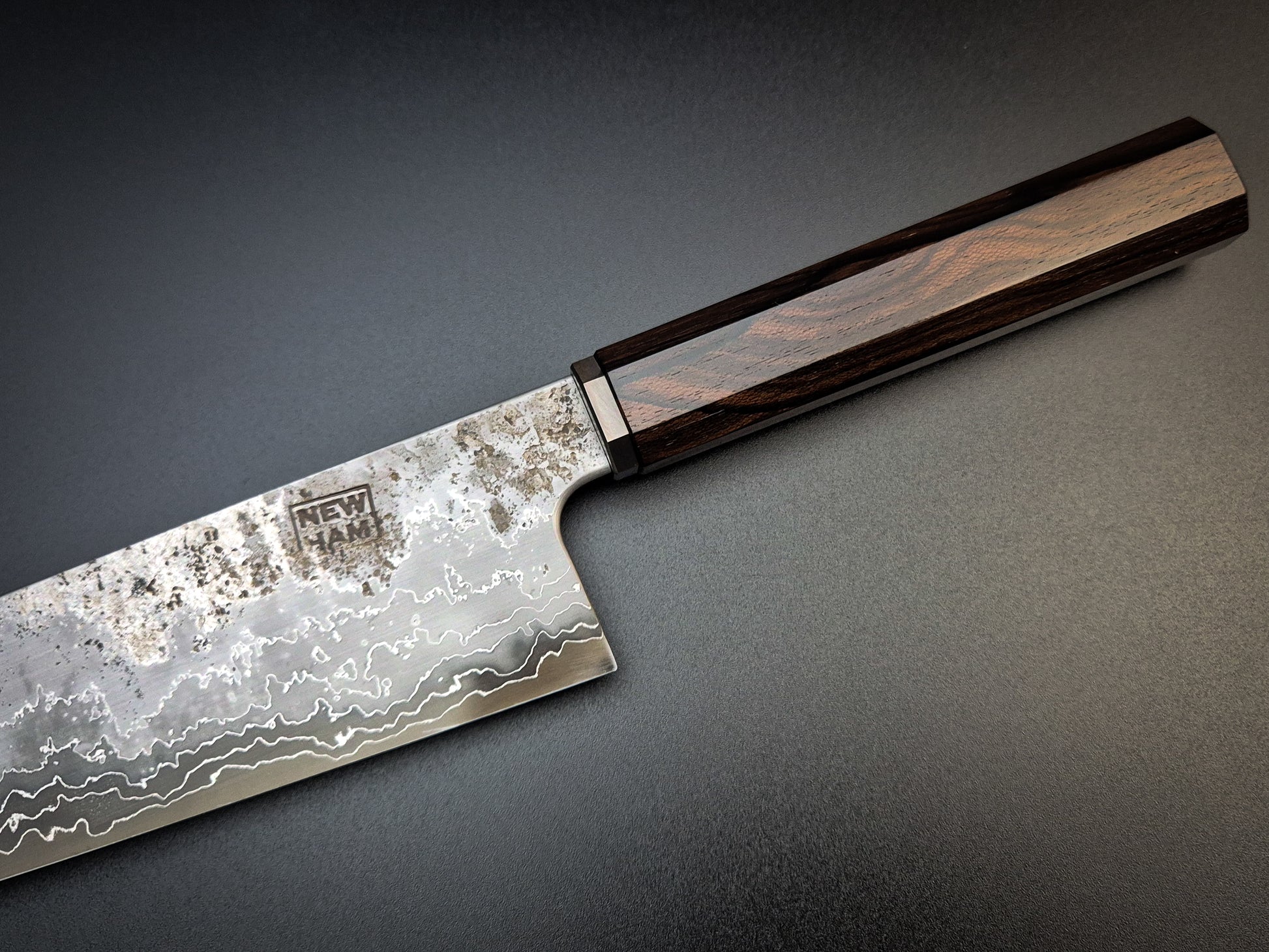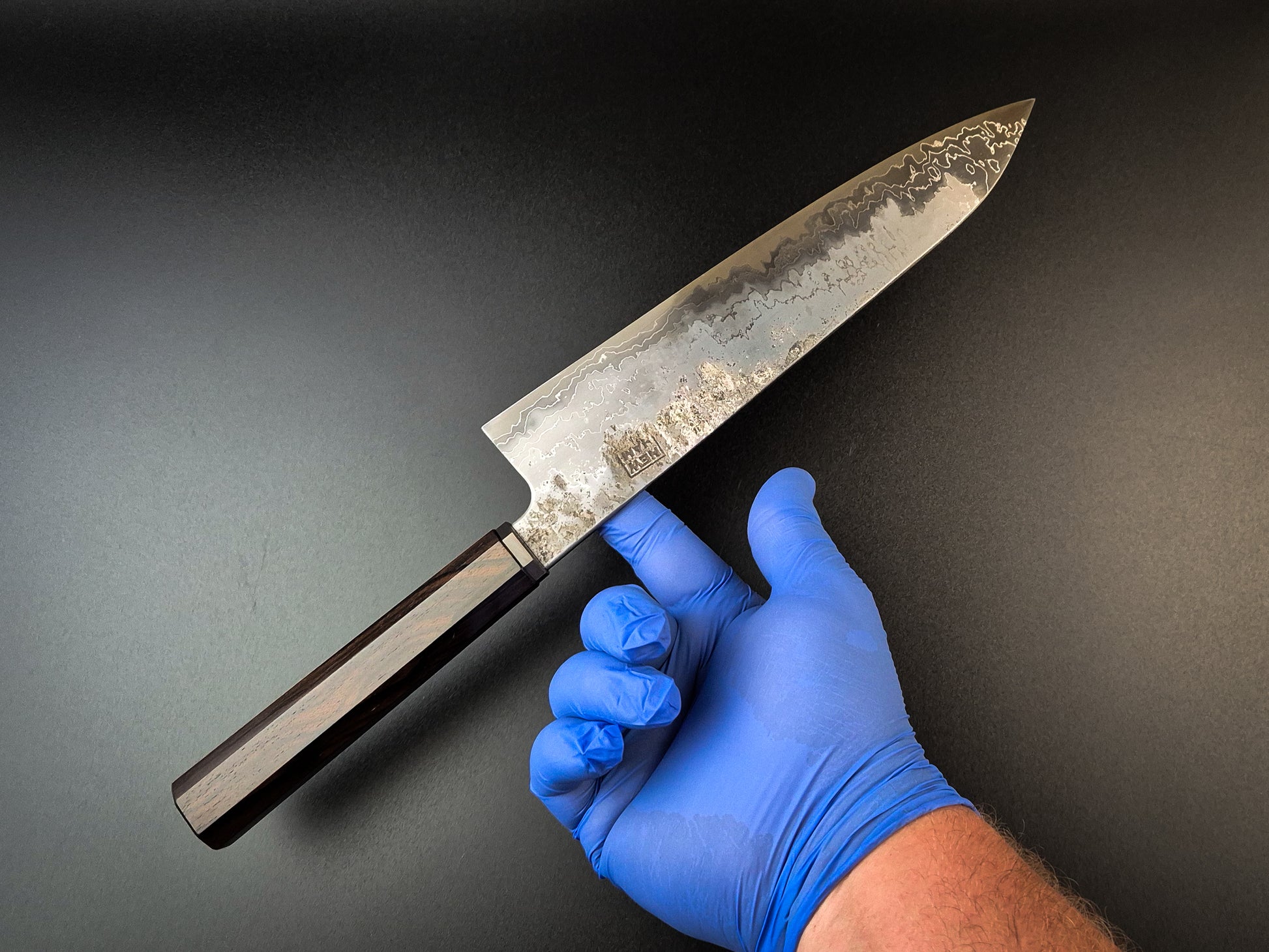 223x53mm gyuto in white 2 with mulit-layer iron cladding. The cladding etches with a beautiful gradient of grey through the layers.