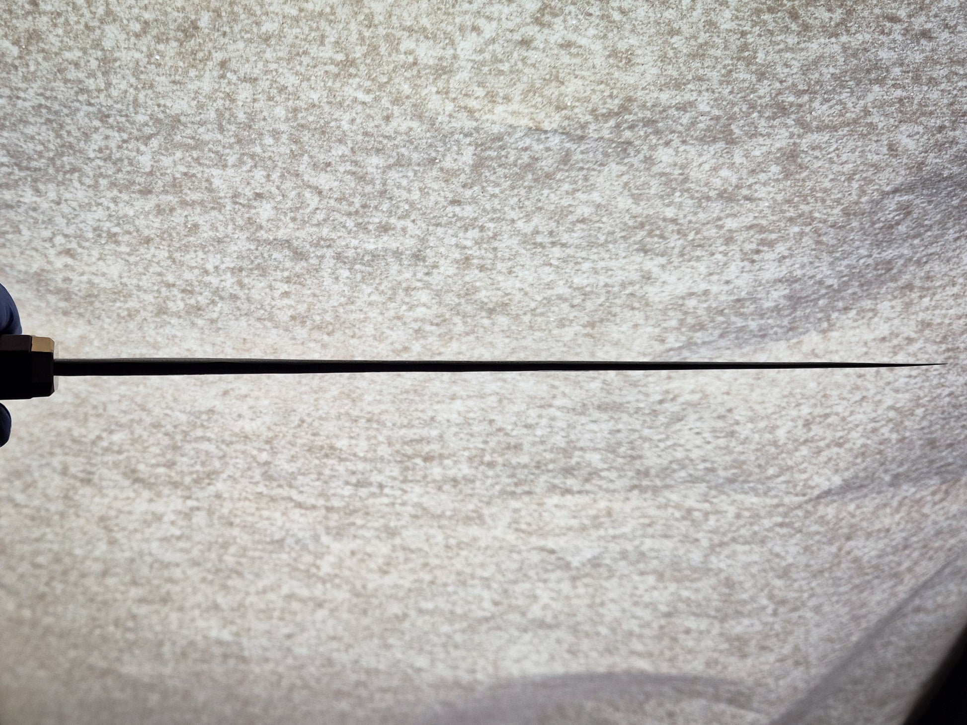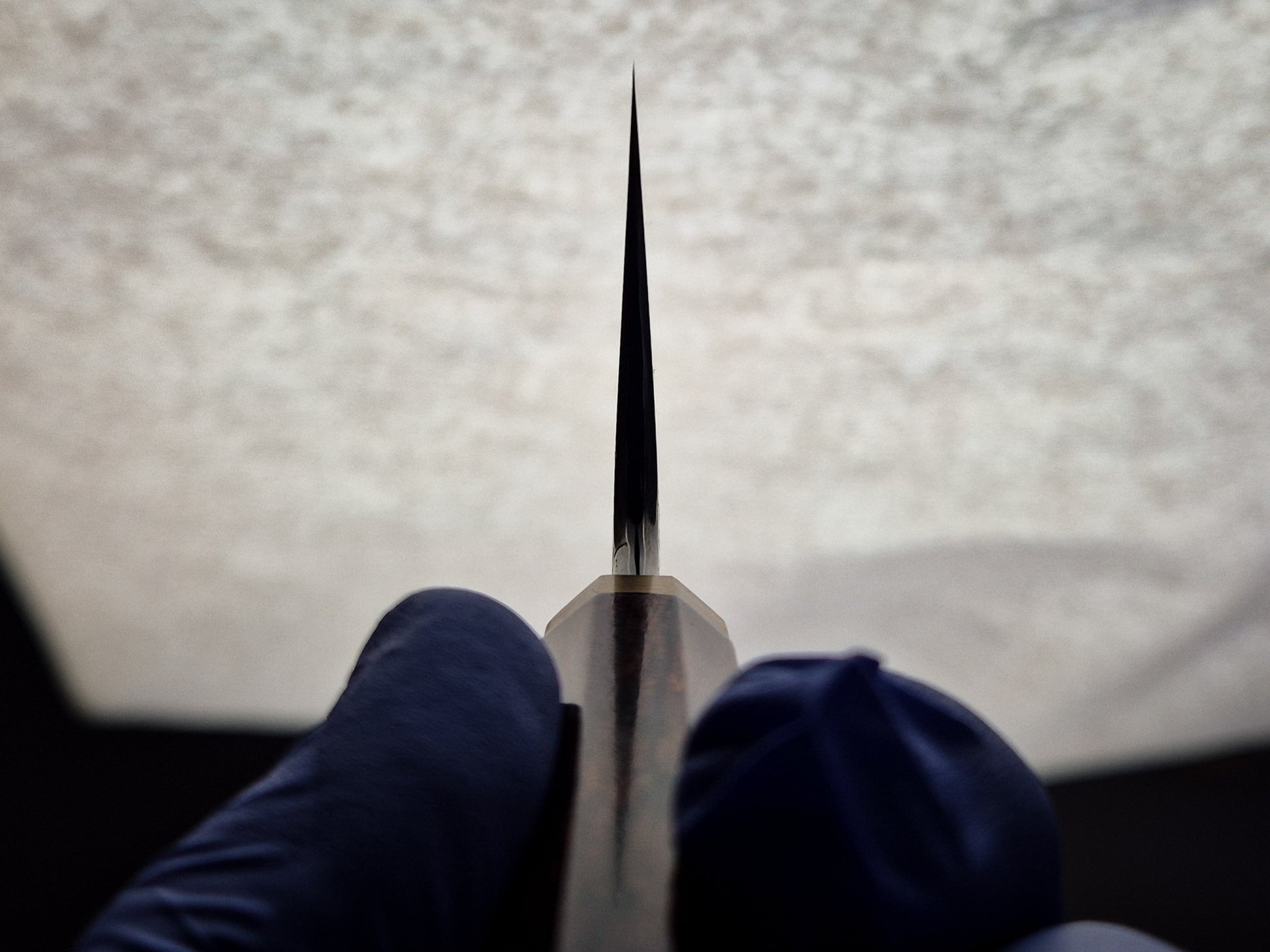 Convex grind with thin edge and sharp distal taper for ultimate performance. Polished spine and choil with satin, hand polished bevels with some forge finish above. Etched to highlight the steel pattern.