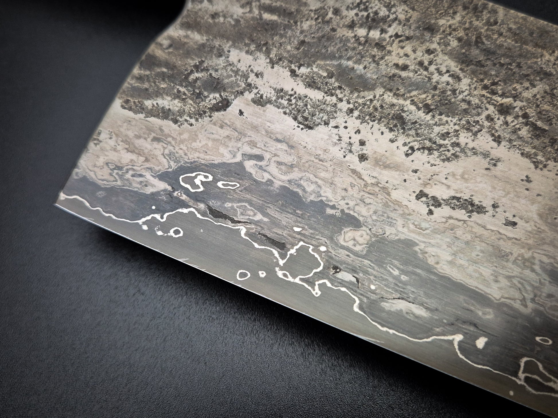Convex grind with thin edge and sharp distal taper for ultimate performance. Polished spine and choil with satin, hand polished bevels with some forge finish and etched to highlight the steel pattern. Please note there are two small wrought inclusions (pictured) these are purely cosmetic and price reflects that.